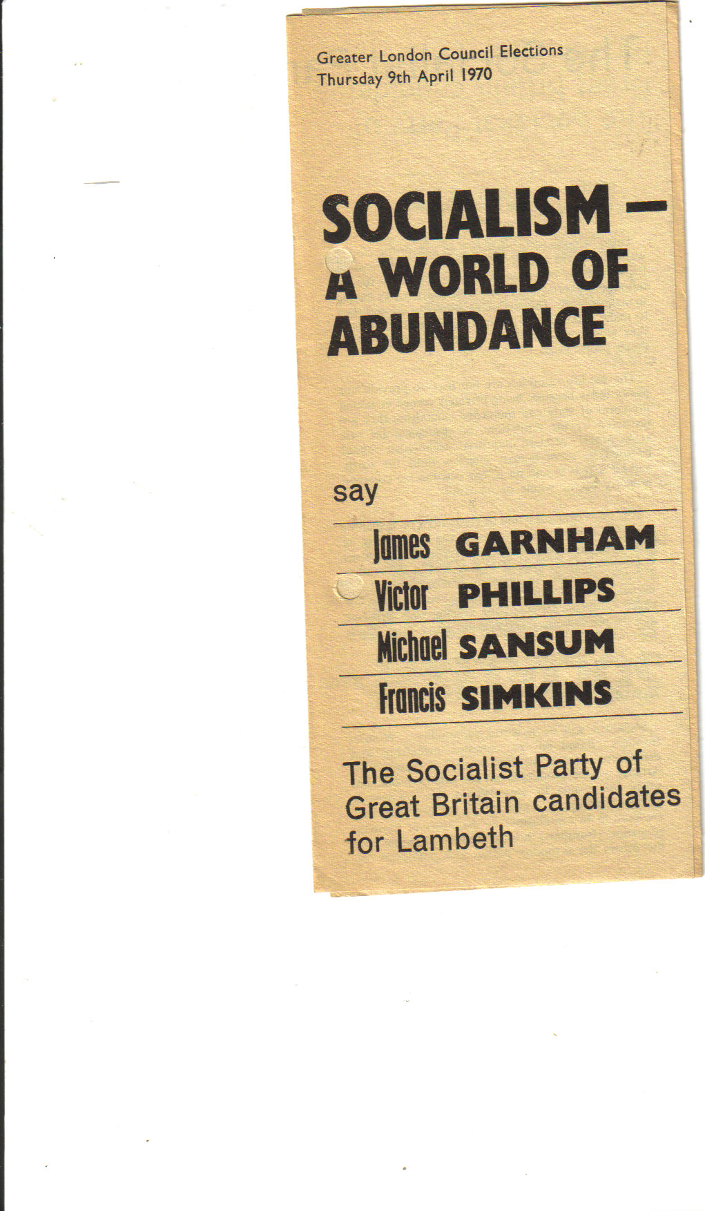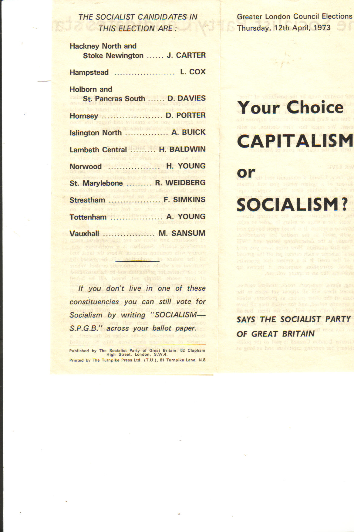 In 1967 in Lambeth one of our candidates beat one of the CP's, securing the highest number of votes ever won by a Socialist candidate in Britain: 1362. Nice if we could make 4 figures this time.